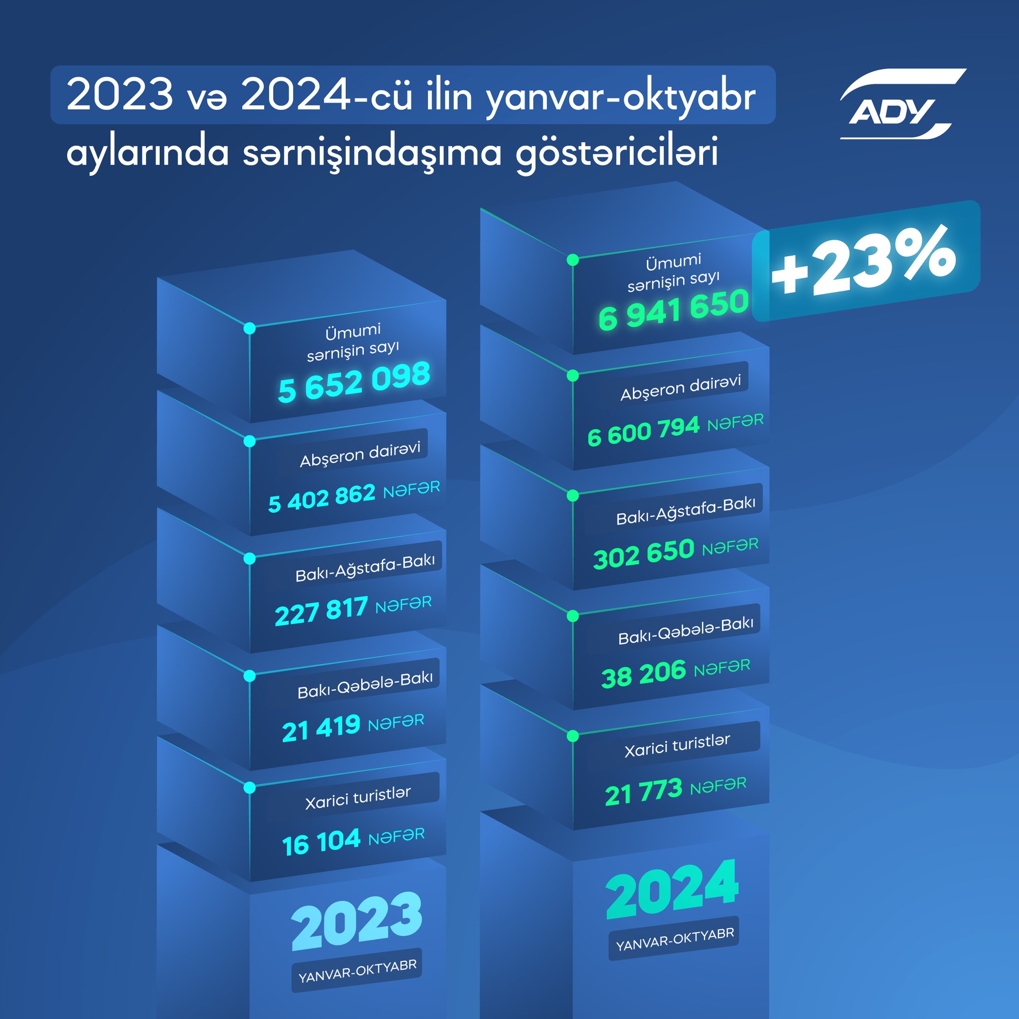 2023-cü və 2024-cü illərin oktyabr ayında daşınan sərnişin sayında isə bu il 24% artım qeydə alınıb.