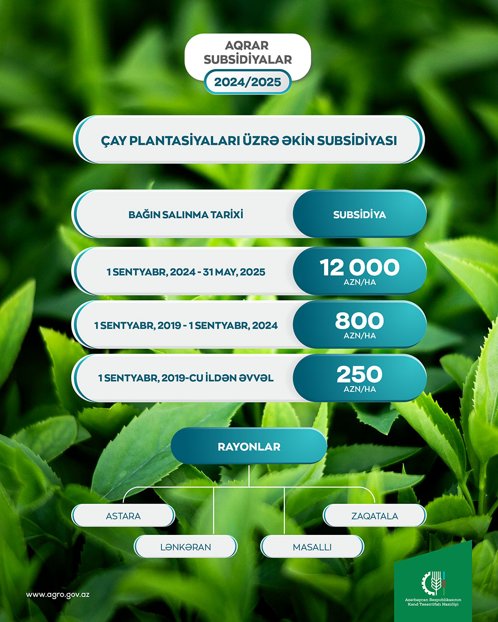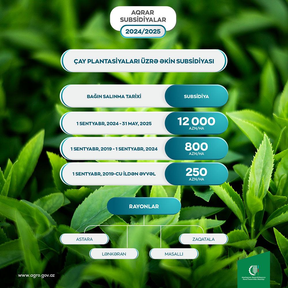 Sentyabrın 1-dən mayın 31-dək Astara, Masallı, Lənkəran və Zaqatalada salınacaq çay plantasiyalarına görə hər hektara 12000 manat subsidiyanın verilməsi çayçılığın inkişafına dəstək mexanizminin bir hissəsidir.