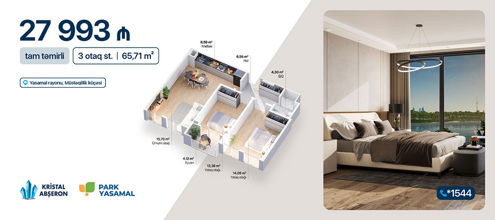 Yüksək keyfiyyət və əlverişli şərtlərlə mənzil axtaranlar olanlar üçün “Park Yasamal” yaşayış kompleksində 2, 3, 4 otaqlı və studiya tipli mənzillər mövcuddur. Üstəlik, “Kristal Abşeron” hazırda cəmi 27 min 993 manat ilkin ödənişlə 3 otaqlı studiyavə tam təmirli mənzil almaq imkanı təklif edir. Məhdud sayda olan bu mənzillərə sahib olmaq üçün “Park Yasamal” layihəsinin satış ofisinə yaxınlaşa bilərsiniz. Qeyd edək ki, “Kristal Abşeron”un bütün satış ofisləri bayram günlərində də fəaliyyət göstərəcək.