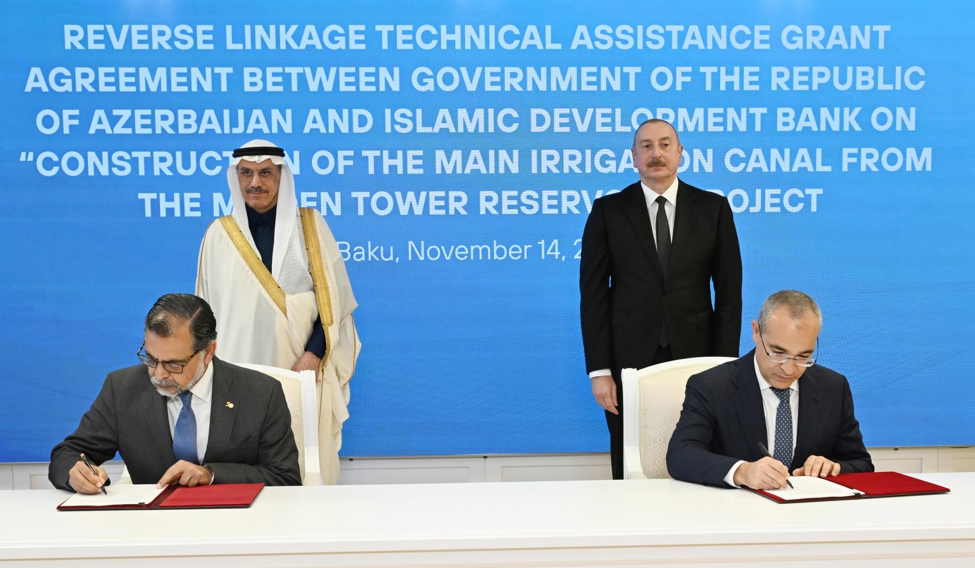 Əvvəlcə Azərbaycan Prezidenti İlham Əliyevin və İslam İnkişaf Bankının prezidenti Məhəmməd Əl-Casirin iştirakı ilə “Azərbaycan Respublikası və İslam İnkişaf Bankı arasında “Qız Qalası su anbarından magistral suvarma kanalının tikintisi” layihəsi üzrə Agentlik müqaviləsi, “Azərbaycan Respublikası Hökuməti və İslam İnkişaf Bankı arasında “Əks Əlaqə Texniki Yardım Qrant Sazişi Qız Qalası su anbarından magistral suvarma kanalının tikintisi layihəsi” və “Azərbaycan Respublikası və İslam İnkişaf Bankı arasında “Qız Qalası su anbarından magistral suvarma kanalının tikintisi” layihəsi üzrə Çərçivə Sazişi imzalanıb.