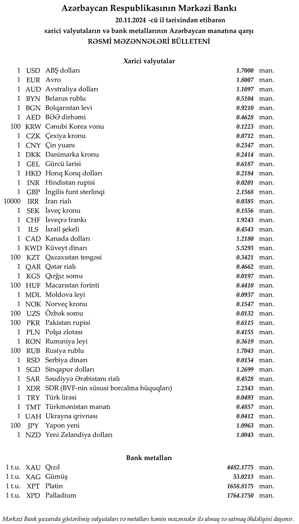 Rəsmi məzənnələr açıqlandı