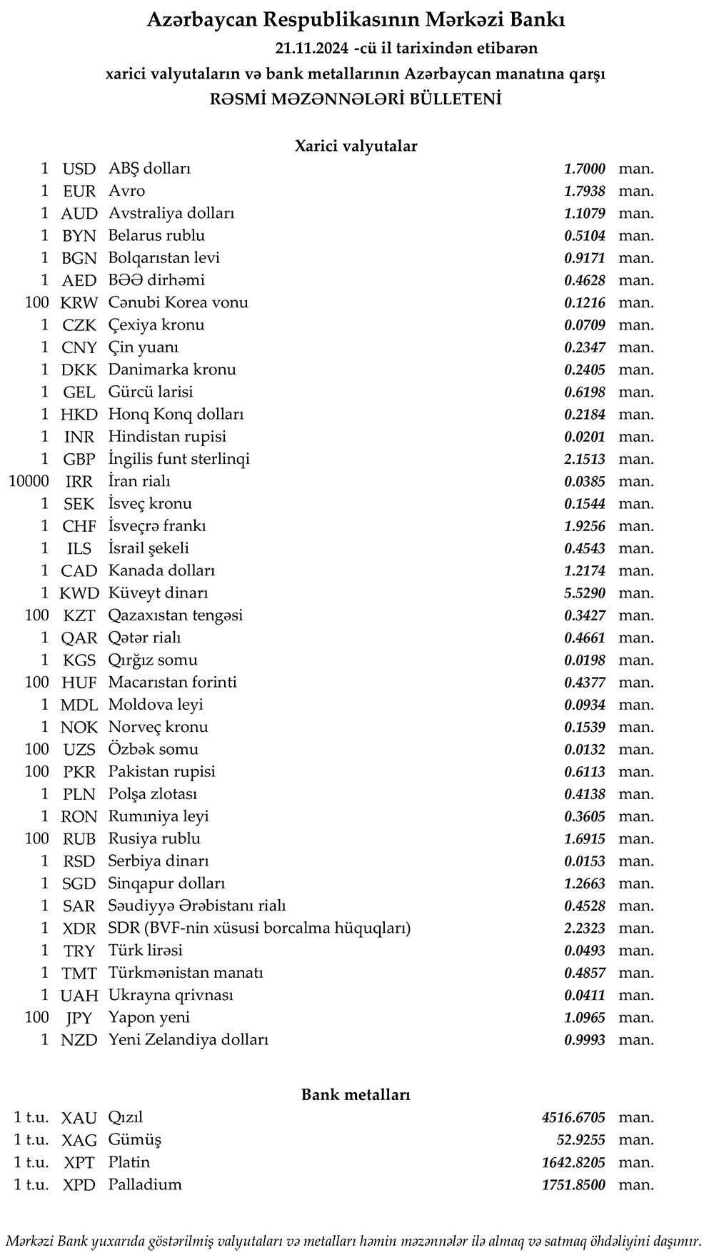 Rəsmi məzənnələr açıqlandı