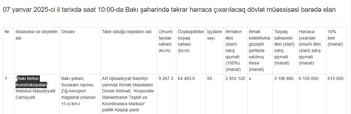 "Bakı Beton Konstruksiyaları" təkrar hərraca çıxarılacaq