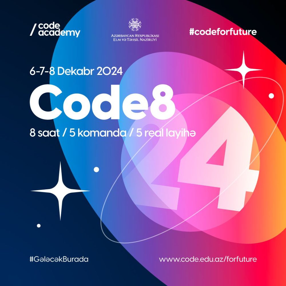 2024-cü ilin yekun tədbiri isə 6-8 dekabr tarixlərində keçiriləcək “Code8” hakatonu olacaq. Azərbaycan Respublikasının Elm və Təhsil Nazirliyi və “Code Academy”nin dəstəyi ilə baş tutacaq tədbirdə Bakı Dövlət Universiteti, Azərbaycan Texniki Universiteti və Azərbaycan Memarlıq və İnşat Universitetinin tələbələri öz bilik və bacarıqlarını nümayiş etdirəcəklər. Hakatonda iştirakçılar real təcrübəyə əsaslanan tapşırıqları qısa zaman çərçivəsində həll edərək tərtibat və proqramlaşdırma sahəsində bacarıqlarını ortaya qoyacaqlar. Layihələr İT mütəxəssisləri tərəfindən qiymətləndiriləcək və ən yaxşı işlər innovativ yanaşmaları və yüksəkkeyfiyyətli icrasına əsasən mükafatlandırılacaq. Bu hakaton tələbələrin texnologiya sahəsində uğurlu karyeraya hazırlığı üçün vacib mərhələ hesab olunur.