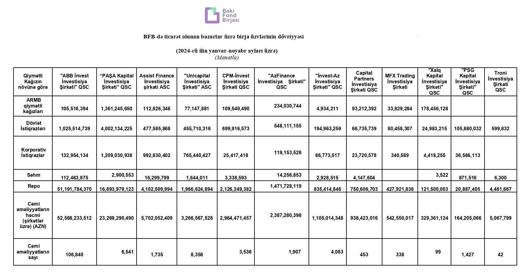 2024-cü ilin yanvar-noyabr ayları üzrə Bakı Fond Birjasında (BFB) ticarət olunan bazarlar üzrə birja üzvlərinin dövriyyələri açıqlanıb.