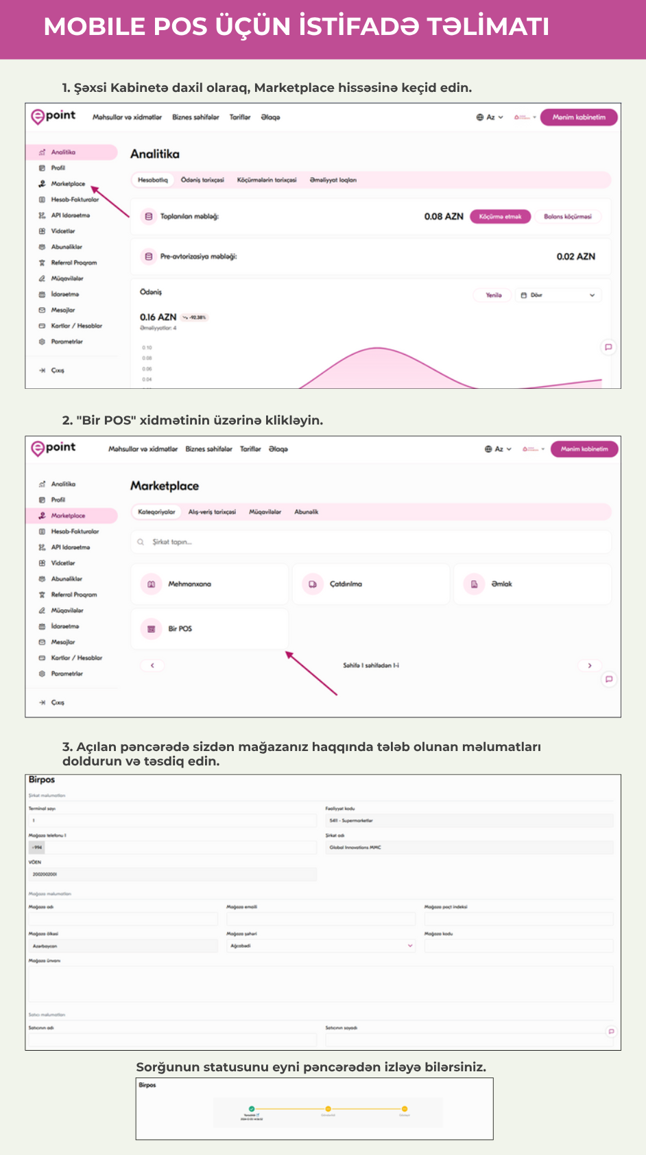 Mobile POS məhsulu və qoşulma imkanları haqqında daha ətraflı məlumat üçün veb saytımıza daxil olun: epoint.az