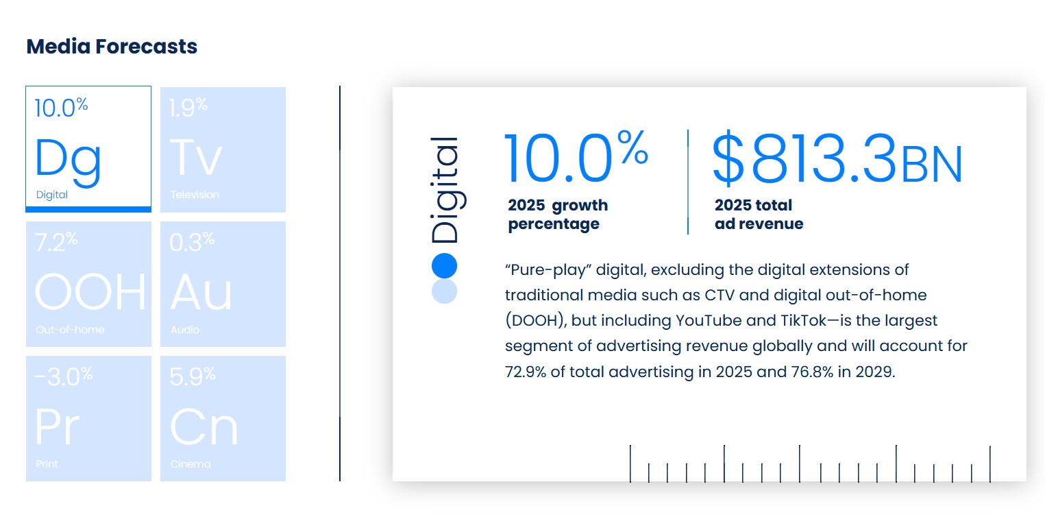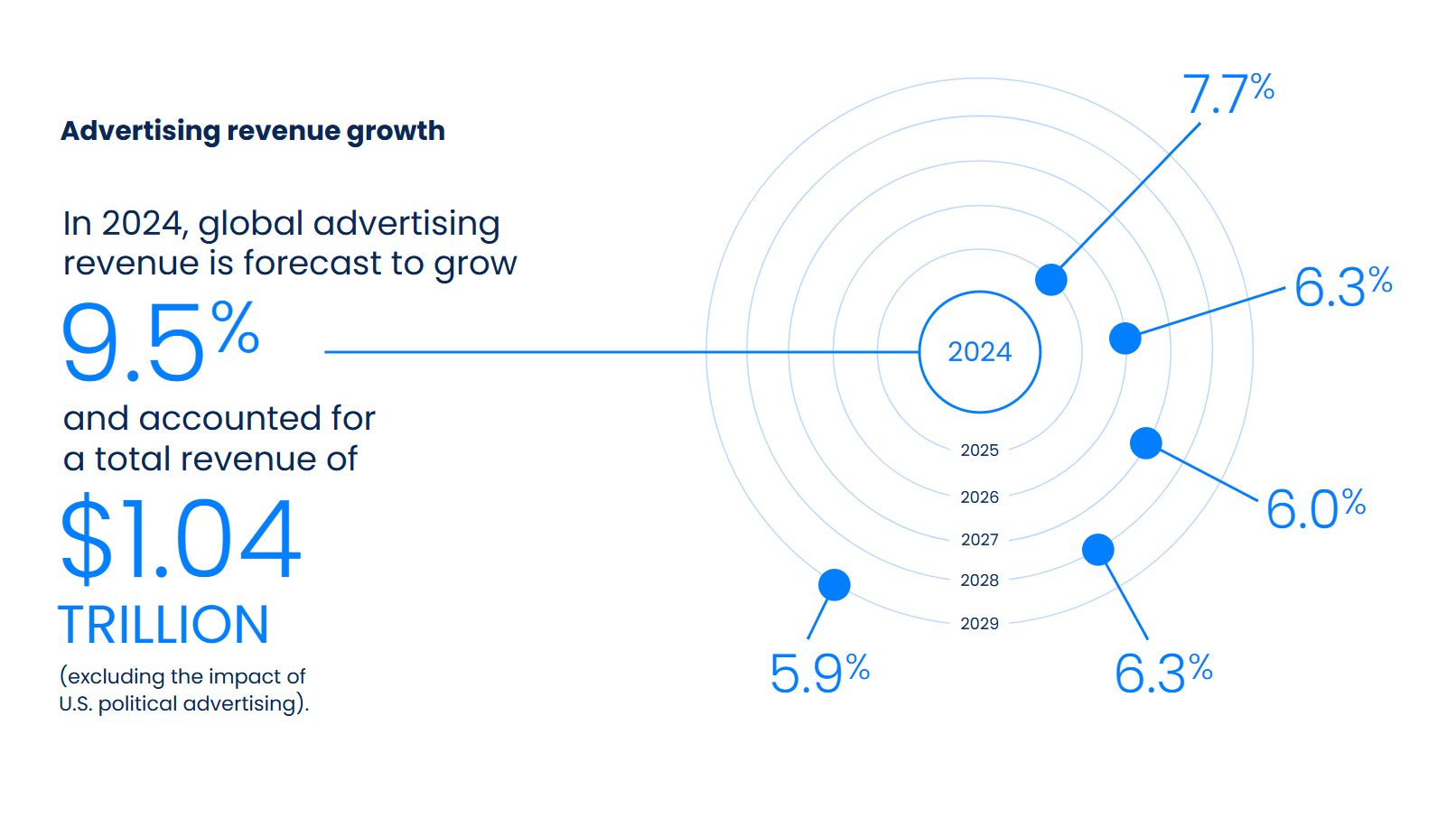 Rəqəmsal reklam 2024-cü ilə qədər qlobal reklam gəlirlərinin 73 faizini təşkil edəcək. Rəqəmsal platformaların gəlirinin illik 12,4 faiz artacağı, televiziya, radio və çap mediası kimi ənənəvi kanalların gəlir itkisi ilə üzləşəcəyi proqnozlaşdırılır. ABŞ 2025-ci ildə 379 milyard dollar gəlirlə dünyanın ən böyük reklam bazarı olacaq. Çinin reklam bazarı 2024-cü ildə 13,5 faiz artaraq 204,5 milyard dollara çatacaq. Süni intellekt və avtomatlaşdırma reklamda innovasiyaları artıraraq böyüməyə təkan verir. Rəqəmsallaşma texnologiya nəhəngləri Google, Meta və Amazon kimi şirkətlərin qlobal reklam bazarında hökmranlığını gücləndirir. Texnologiya sektorunun hakim olduğu bu bazarda Google, Meta, ByteDance, Amazon və Alibaba ümumi gəlirin yarıdan çoxunu qazanacaqlar.Qlobal reklam bazarının həcmi bu il ilk dəfə olaraq 1 trilyon dolları keçəcək. Bazarın 2025-ci ildə 7,7% artaraq 1,1 trilyon dollara çatacağı nəzərdə tutulur.