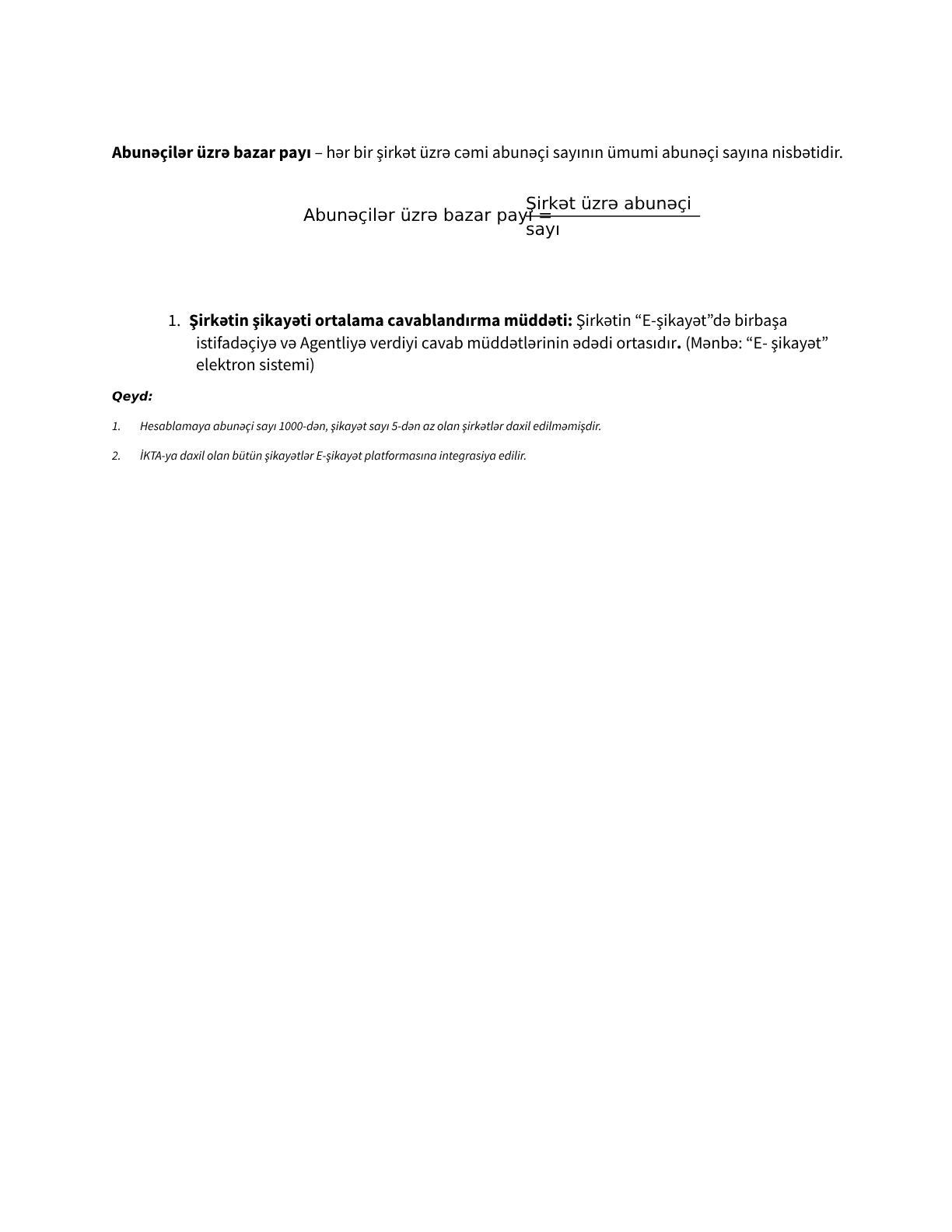 Beynəlxalq metodologiyaya uyğun olaraq, şikayət indeksi və şikayətlərin ortalama cavablandırılma müddəti telekommunikasiya operator və provayderlərinə daxil olan şikayətlər üzrə bazar payının onların abunəçilər üzrə bazar payına olan nisbəti kimi hesablanır.