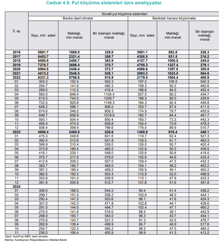 Müqayisə üçün qeyd edək ki, 2023-cü ilin yanvar-noyabr dövründə sürətli pul köçürmə sistemlərilə Azərbaycandakı banklara 2 milyard 267,2 milyon manat daxil olmuş, 564,8 milyon manat xaricə köçürülmüşdü.