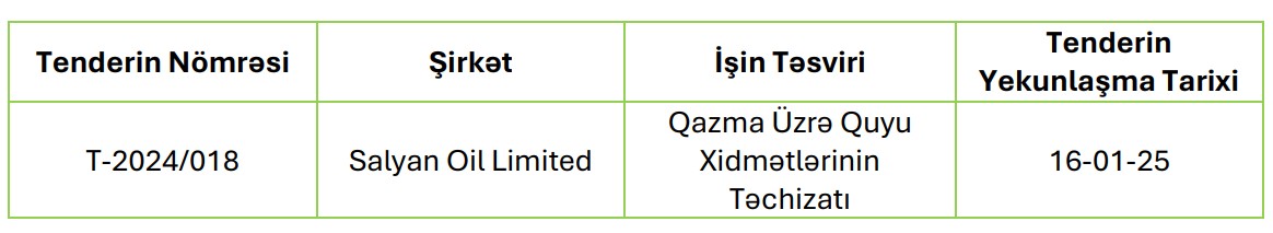 (®) "GL Group" MMC-yə məxsus "Salyan Oil Limited" şirkəti tərəfindən "Qazma Üzrə Quyu Xidmətlərinin göstərilməsi" üçün tender elan edilib. Tenderin son tarixi 16 Yanvar 2025-ci ildir.