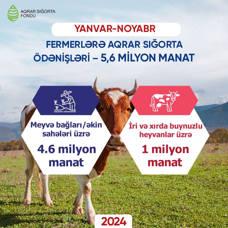 Aqrar Sığorta Fondunun məlumatına görə, 2024-cü ilin yanvar-noyabr aylarında müxtəlif hadisələr nəticəsində zərərlə üzləşmiş sığortalı fermerlərə 5 milyon 642 min manat sığorta ödənişi edilib.