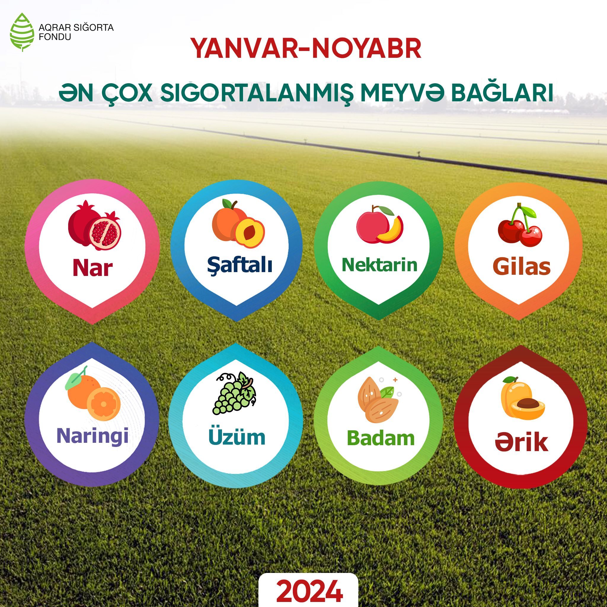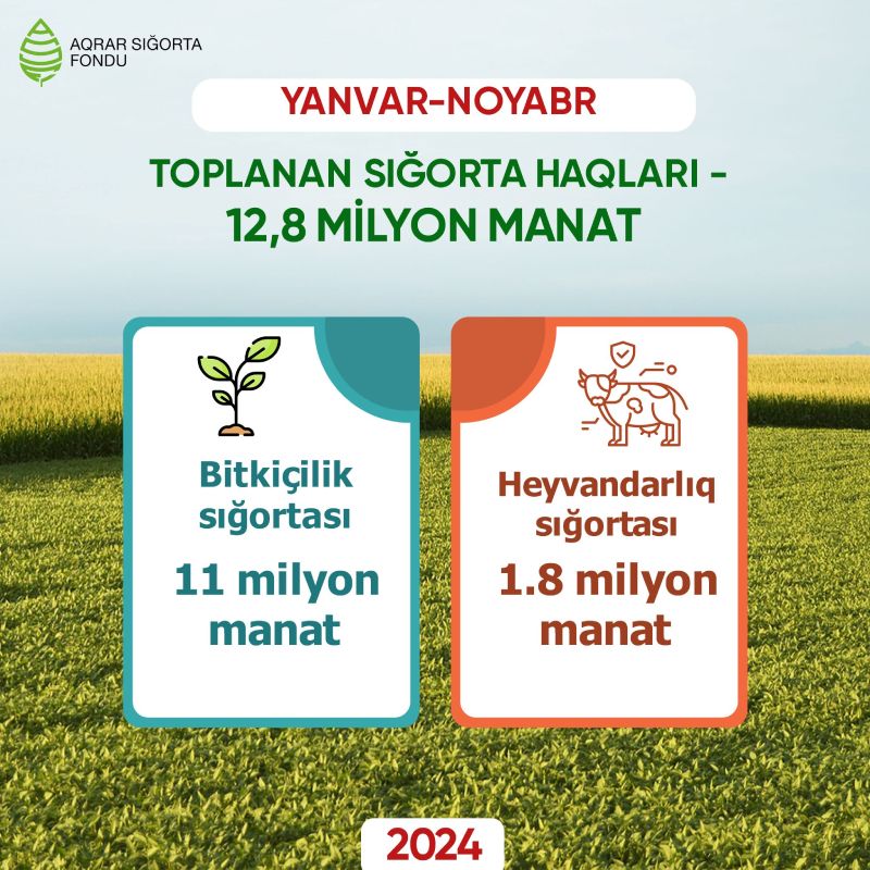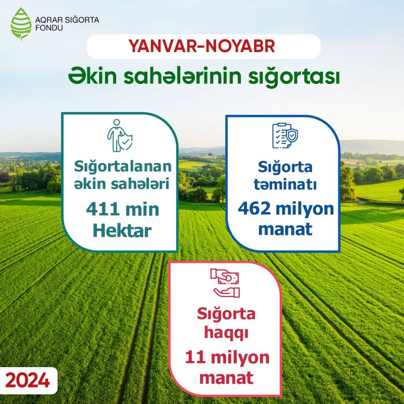 2024-cü ilin yanvar-noyabr aylarında Aqrar Sığorta Fondu tərəfindən ümumilikdə 410 min 561 hektar əkin sahəsi sığortalanıb. Əkin sahələrinə 462 milyon manat məbləğində sığorta təminatı verilib.