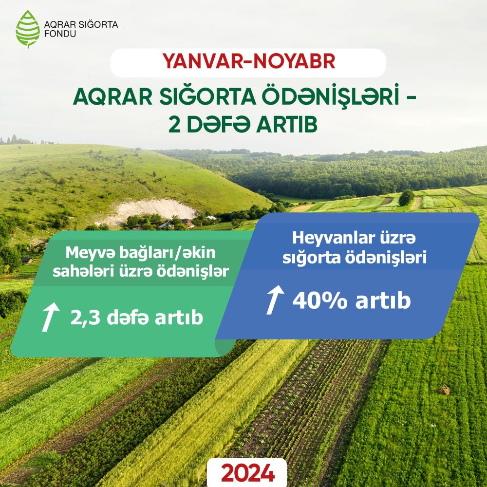 2023-cü ilin eyni dövrünə nisbətən sığorta ödənişlərinin məbləği 2 dəfə, o cümlədən meyvə bağları/əkin sahələri üzrə ödənişlər 2,3 dəfə, heyvnadarlıq təsərrüfatları üzrə ödənişlər isə 40% artıb.