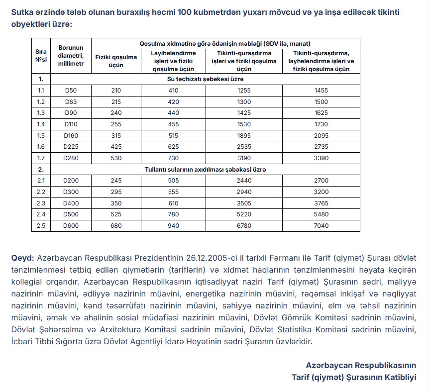 Sutka ərzində tələb olunan buraxılış həcmi 100 kubmetrə qədər olan tikinti obyektləri üçün su təchizatı şəbəkəsinə qoşulmanın birdəfəlik tarifi borunun diametrinden asılı olaraq 995 manat və ya 1015 manat, tullantı sularının axıdılması şəbəkəsinə qoşulmaya görə 1635 manat məbləğində müəyyən edilib.