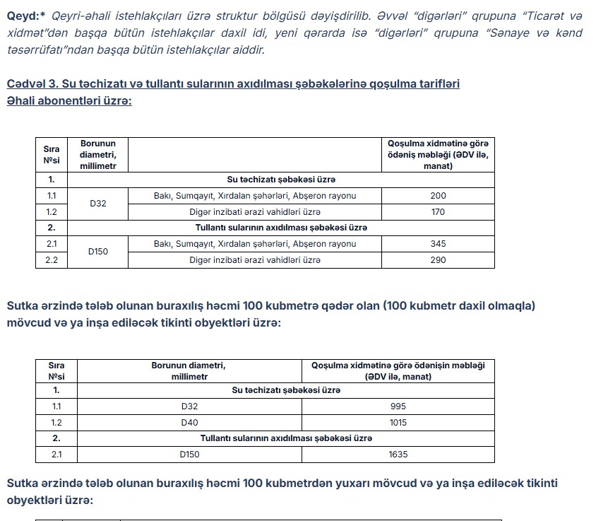 Əhali abonentləri üçün Bakı, Sumqayıt, Xırdalan şəhərləri, Abşeron rayonu üzrə su təchizatı şəbəkəsinə qoşulmanın birdəfəlik tarifi 200 manat, digər inzibati ərazi vahidləri üzrə isə 170 manat müəyyən edilib. Tullantı sularının axıdılması şəbəkəsinə qoşulma üzrə tariflər Bakı, Sumqayıt, Xırdalan şəhərləri, Abşeron rayonu üzrə 345 manat, digər inzibati ərazi vahidləri üzrə isə 290 manat səviyyəsində təsdiq edilib.