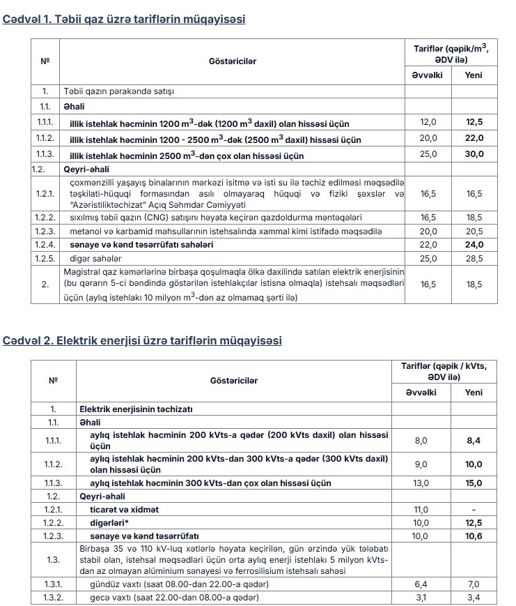 Elektrik istehsalında istifadə olunan təbii qazın tarifi 2 qəpik (12,1%) artırılaraq 16,5 qəpikdən 18,5 qəpik səviyyəsində, sənaye və kənd təsərrüfatı sahələri üzrə 1 kub metr təbii qazın tarifi 2 qəpik (9%) artırılaraq 22 qəpikdən 24 qəpik həddində müəyyənləşdirilib.