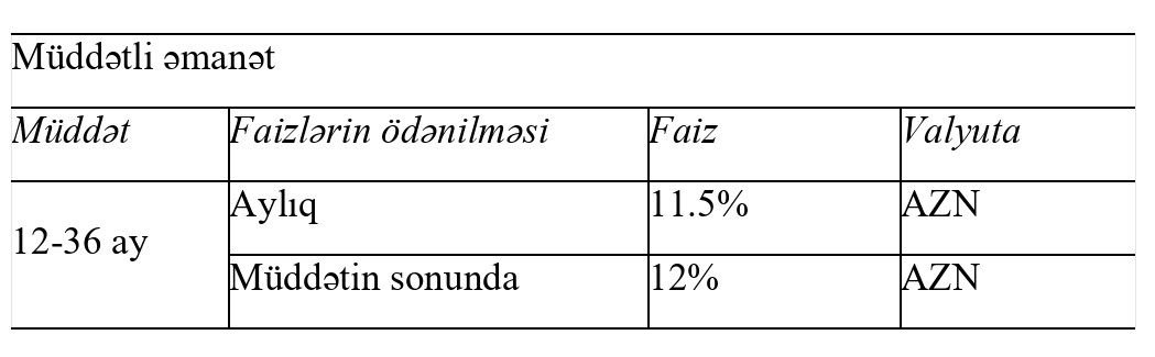 Faizlərin ödənilməsi əmanətin müddətindən asılı olaraq aylıq əsasda və ya müddətin sonunda həyata keçəcək. Vəsaiti 12-36 ayadək yerləşdirdikdə aylıq 11.5%, müddətin sonunda isə 12% gəlir qazandıracaq.