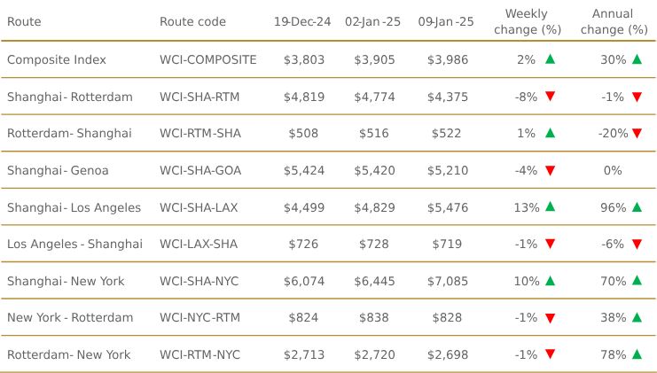 Drewry's World Container Index bu həftə 2% artaraq 40 futluq konteyner üçün 3986 dollara çatıb.Qlobal konteyner daşıma qiymətləri 2025-ci ilə artımla başlayıb və ardıcıl üçüncü həftə yüksəlib. Qiymətlər təxminən son 4 ayın ən yüksək səviyyəsinə çatıb.