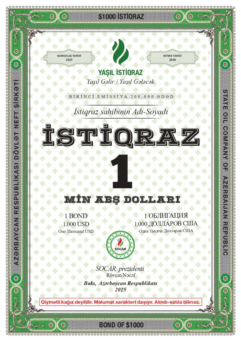 Nominal dəyəri 1000 ABŞ dolları olan istiqrazlar sahiblərinə illik 6% gəlir qazandıracaq.Azərbaycan Respublikası Dövlət Neft Şirkəti (SOCAR) 15 yanvar 2025-ci il tarixindən etibarən "Yaşıl istiqraz"ların buraxılışına start verir.