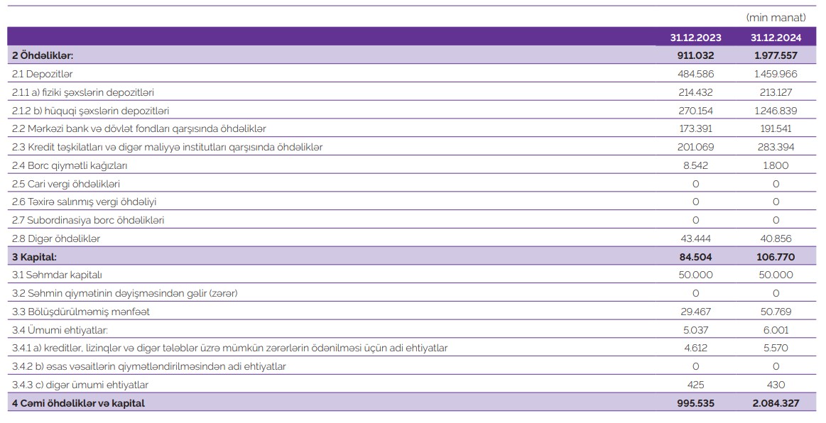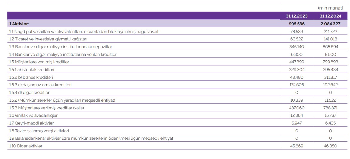 Ötən il "Azər-Türk Bank"ın cəmi aktivləri 1 milyard manatdan çox artaraq 2 milyard manat səviyyəsini aşıb. Sürətlə böyümənin mənbəyi hüquqi şəxslərin depozitləri üzrə Banka böyük məbləğdə vəsaitin daxil olmasıdır.Səhmlərinin nəzarət paketi Azərbaycan dövlətinə məxsus olan "Azər-Türk Bank" ASC 2024-cü ili 21 milyon 308 min manat xalis mənfəət ilə başa vurub. Bank 2023-cü ili 14 milyon 41 min manat xalis mənfəət ilə bağlamışdı. Beləliklə, "Azər-Türk Bank"ın xalis mənfəəti 2024-cü ildə 2023-cü illə müqayisədə 7 milyon 267 min manat və ya 51.7% (1,5 dəfə) artıb.