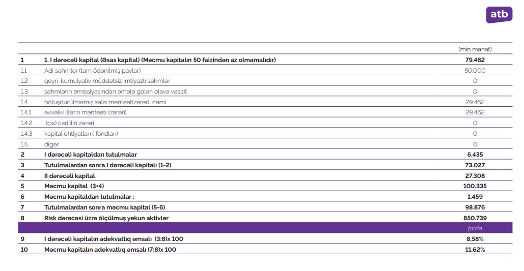 31 dekabr 2024-cü il tarixində "Azər-Türk Bank" 98 milyon 876 min manat məcmu kapitala malik olub. Bank 2023-cü ilin sonunda 78 milyon 437 min manat məcmu kapitala malik idi.