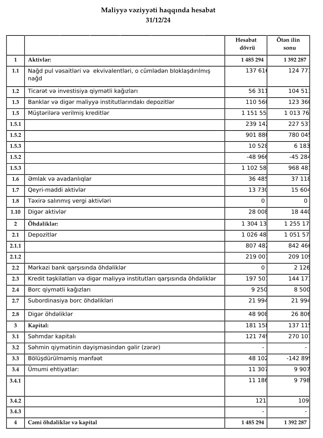 - Depozit portfelinin həcmi 1 milyard manatdan yüksəkdir və 2024-cü ilin sonuna 1 026.5 milyon manat təşkil edir.