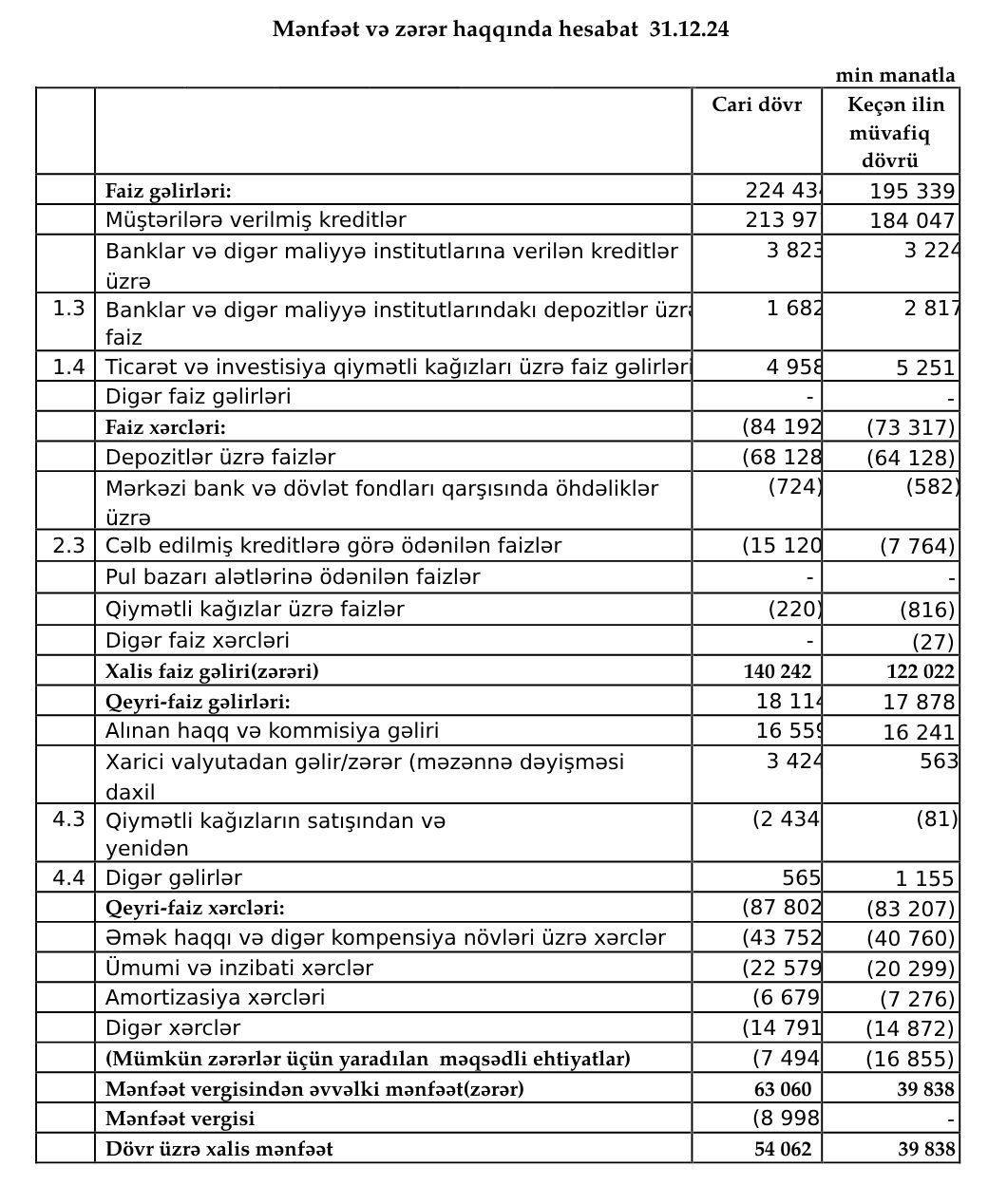 - Faiz gəlirləri 2023-cü il ilə müqayisədə 14.9% artaraq 224.4 milyon manat təşkil edib. Xalis faiz gəlirləri isə 2023-cü il ilə müqayisədə 18.2 milyon artaraq 140.2 milyon manata yüksəlib.