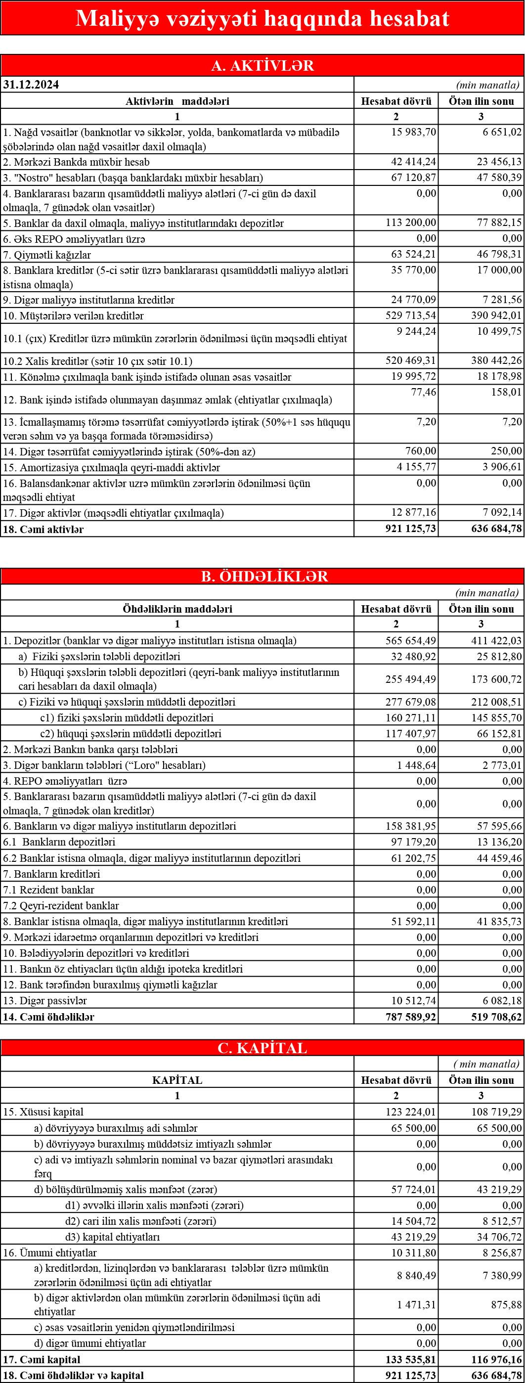“Ziraat Bank Azərbaycan” ötən ilin əməliyyat mənfəəətindən 14 milyon 26 min manat aktivlər üzrə mümkün zərərlərin ödənilməsi üçün xüsusi ehtiyatın yaradılmasına ayırıb (2023-cü ildə 14 milyon 283 min manat ayırmışdı).