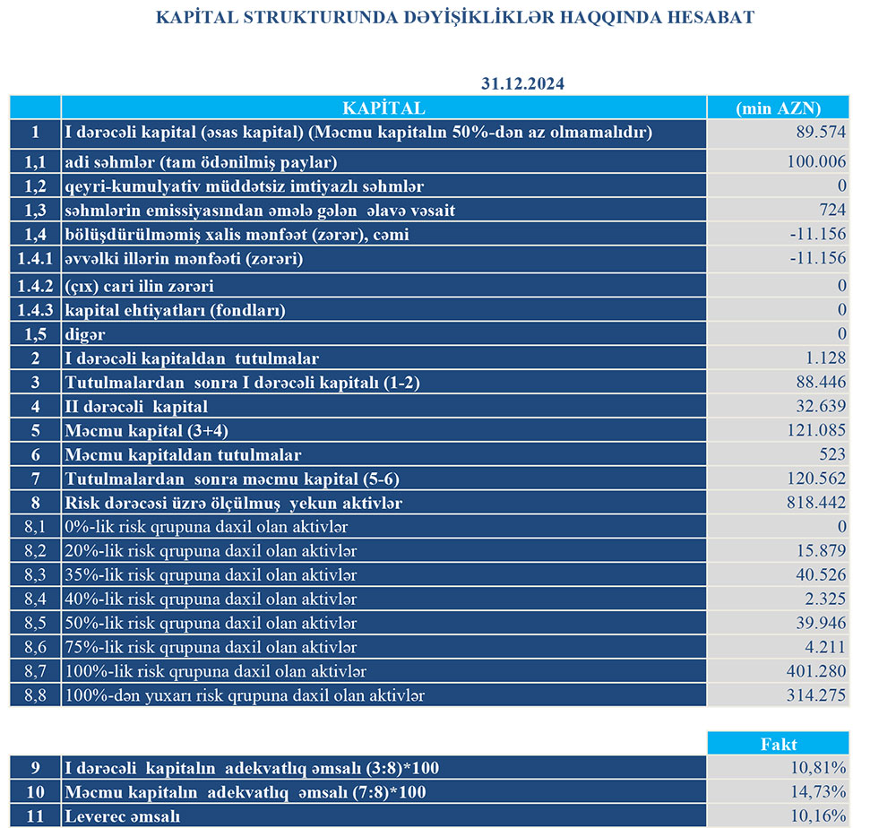 31 dekabr 2024-cü il tarixində "Turanbank" 120 milyon 562 min manat məcmu kapitala malik olub.
