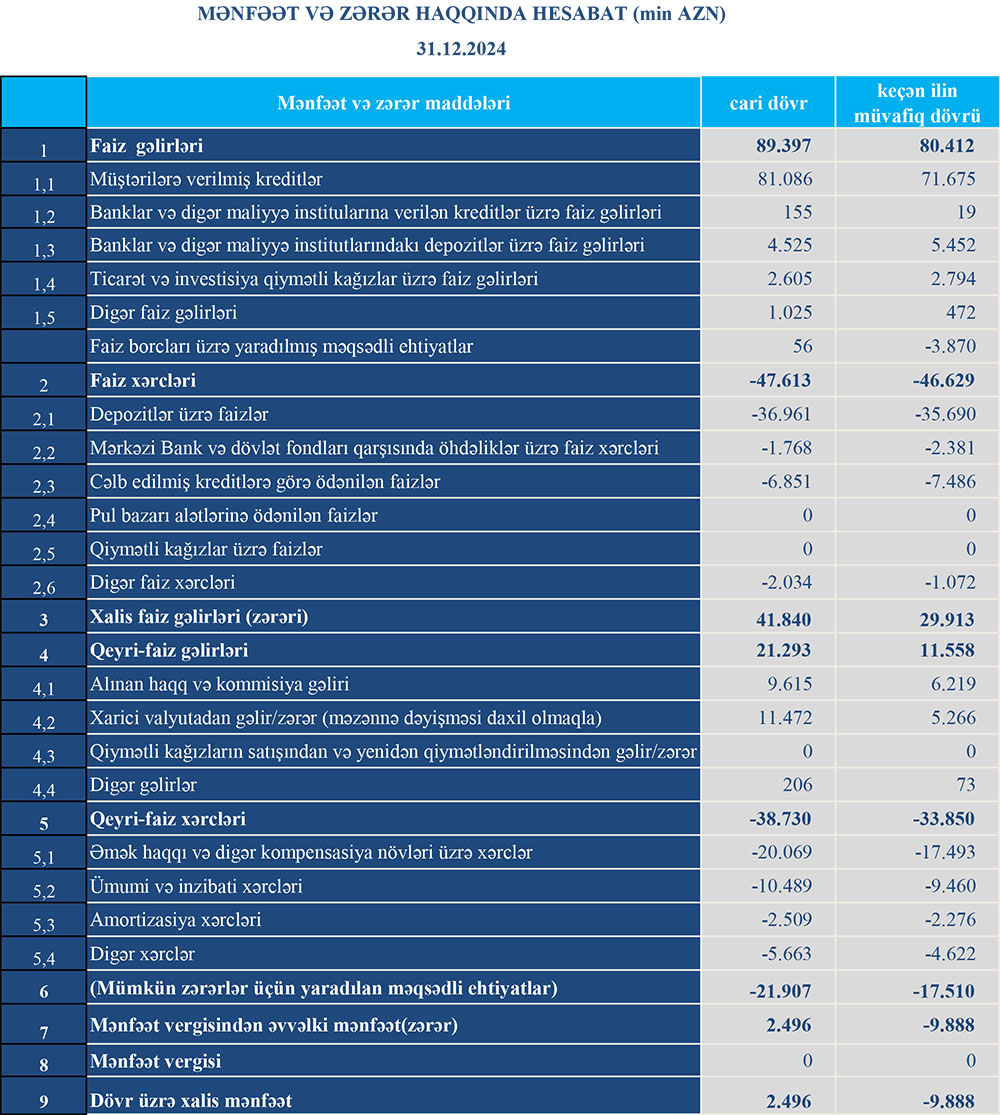 Müqayisə üçün qeyd edək ki, 2023-cü ildə "Turanbank"ın cəmi əməliyyat gəlirləri 91 milyon 970 min manat, cəmi əməliyyat xərcləri 84 milyon 349 min manat, əməliyyat mənfəəti 7 milyon 621 min manat təşkil etmişdi. Bank 17 milyon 510 min manat mümkün zərərlər üçün yaradılan məqsədli ehtiyatlara ayırmışdı.