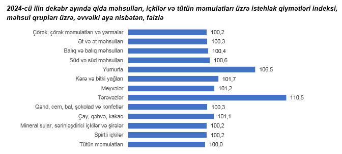 2024-cü ilin dekabr ayında qida məhsulları, içkilər və tütün məmulatları üzrə istehlak qiymətləri indeksi əvvəlki aya nisbətən 2 faiz, yanvar-dekabr aylarında isə əvvəlki ilin müvafiq dövrünə nisbətən 1,3 faiz artıb.