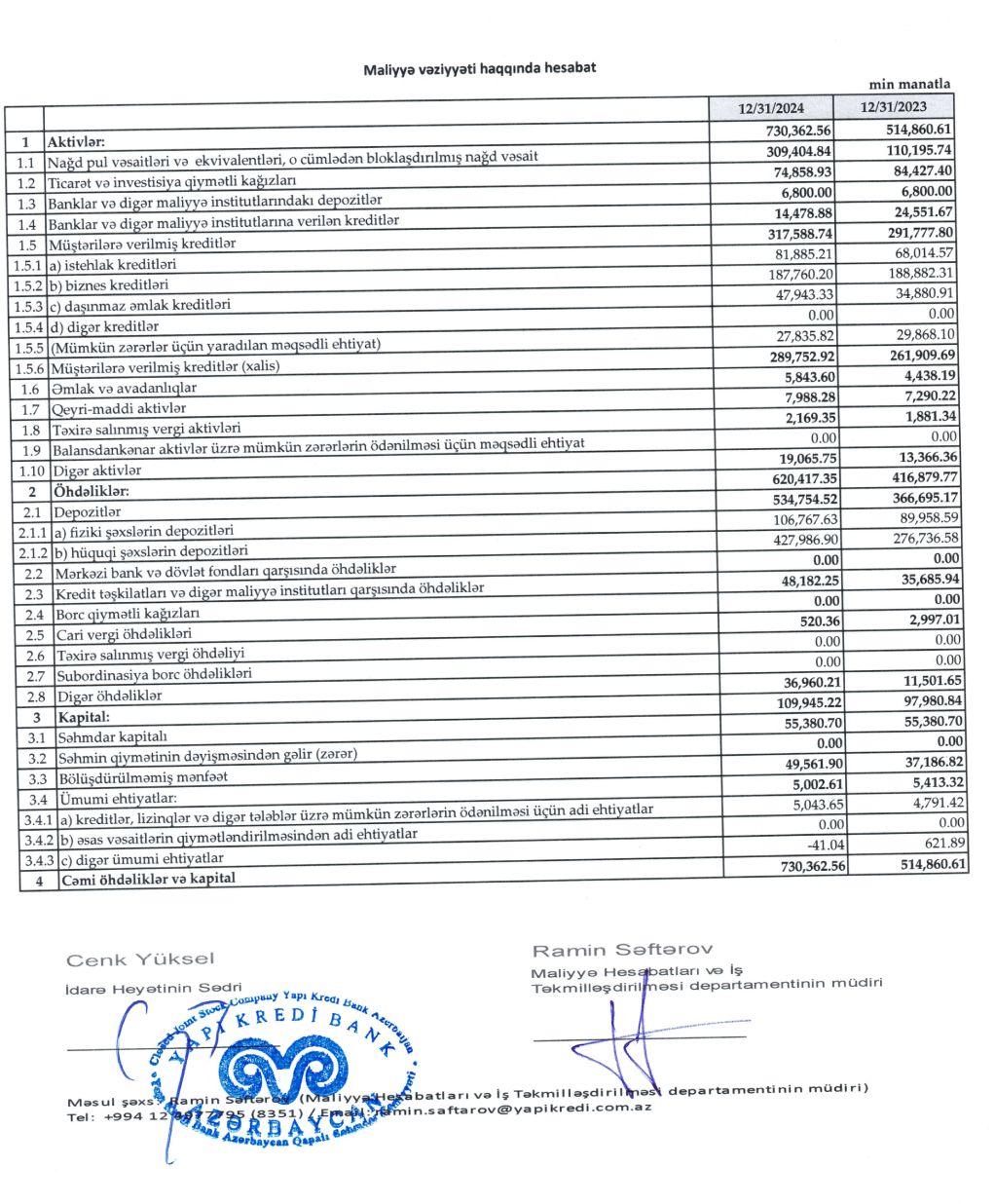 "Yapı Kredi Bank Azərbaycan" QSC 2024-cü il üzrə maliyyə nəticələrini açıqlayıb.