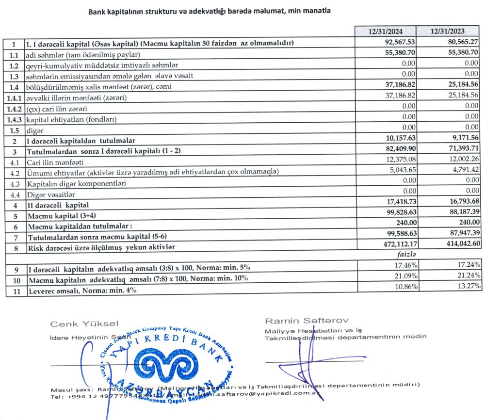 2024-cü ilin göstəricilərinə əsasən Yapı Kredi Bank Azərbaycan Mərkəzi Bankı tərəfindən müəyyən olunmuş prudensial normativləri lazımı səviyyədə yerinə yetirmişdir. Belə ki, müvafiq dövrün sonuna bankın I dərəcəli kapitalının adekvatlıq əmsalı 17%, məcmu kapitalının adekvatlıq əmsalı isə 21% olmuşdur.