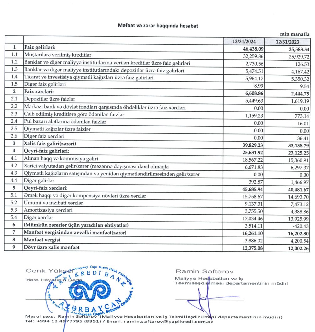 “Yapı Kredi Bank Azərbaycan” 2024-cü ili 12,4 milyon manat mənfəətlə başa vurub