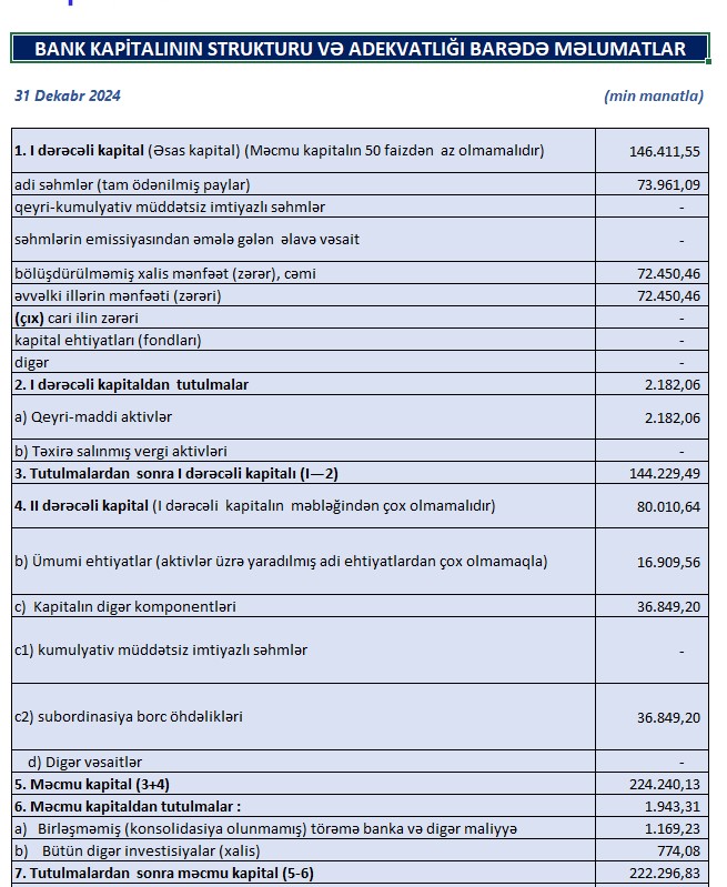 31 dekabr 2024-cü il tarixində “Bank Respublika” ASC 222 milyon 296 min manat məcmu kapitala malik olub. Bank 2023-cü ilin sonunda 165 milyon 910 min manat məcmu kapitala malik idi.