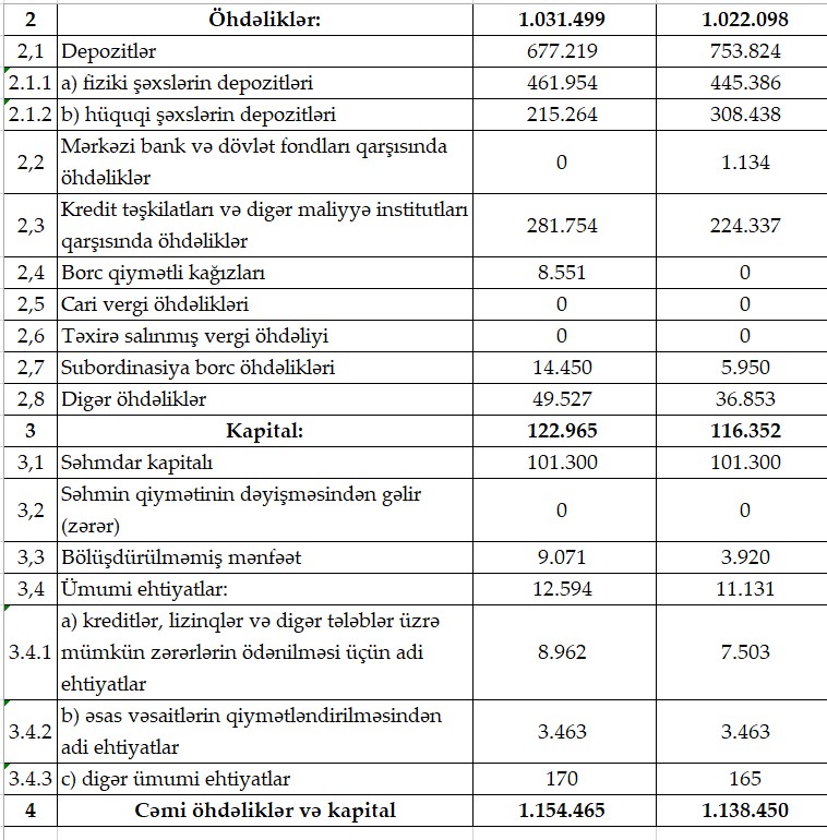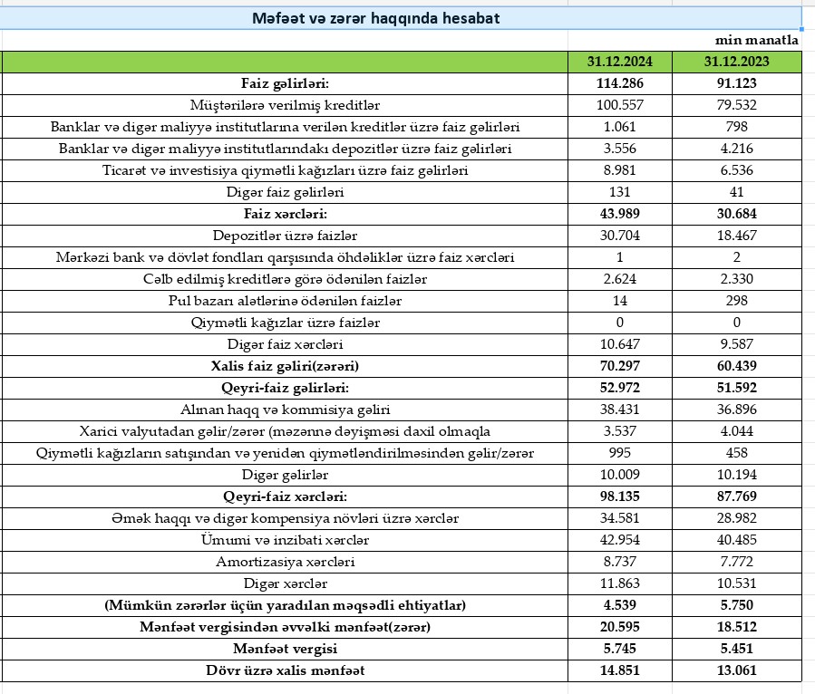 Müqayisə üçün qeyd edək ki, 2023-cü ildə "Rabitəbank"ın cəmi əməliyyat gəlirləri 142 milyon 715 min manat, cəmi əməliyyat xərcləri 118 milyon 453 min manat, gəlirlər xərcləri üstələdiyindən əməliyyat mənfəəti 24 milyon 262 min manat təşkil etmişdi.