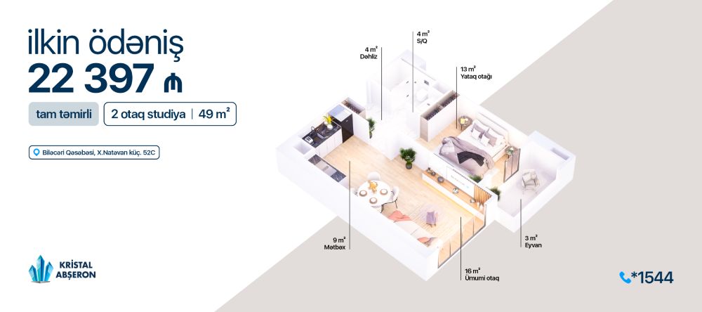 Biləcəridə 22 397 AZN ilkin ödənişlə mənzil sahibi olun - Kristal Abşeron!