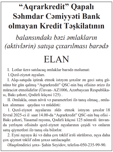 “Aqrarkredit” QSC Bank Olmayan Kredit Təşkilatı balansındakı qızıl-ziynət əşyalarını satır.
