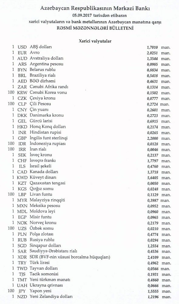 Sentyabrın 5-nə Mərkəzi Bankın açıqladığı rəsmi Dollar/manat məzənnəsi Avqustun 31-i ilə müqayisədə dəyişməyərək 1,7010 manat olub, Avro/manat məzənnəsi isə 2.0251 manata qalxıb.