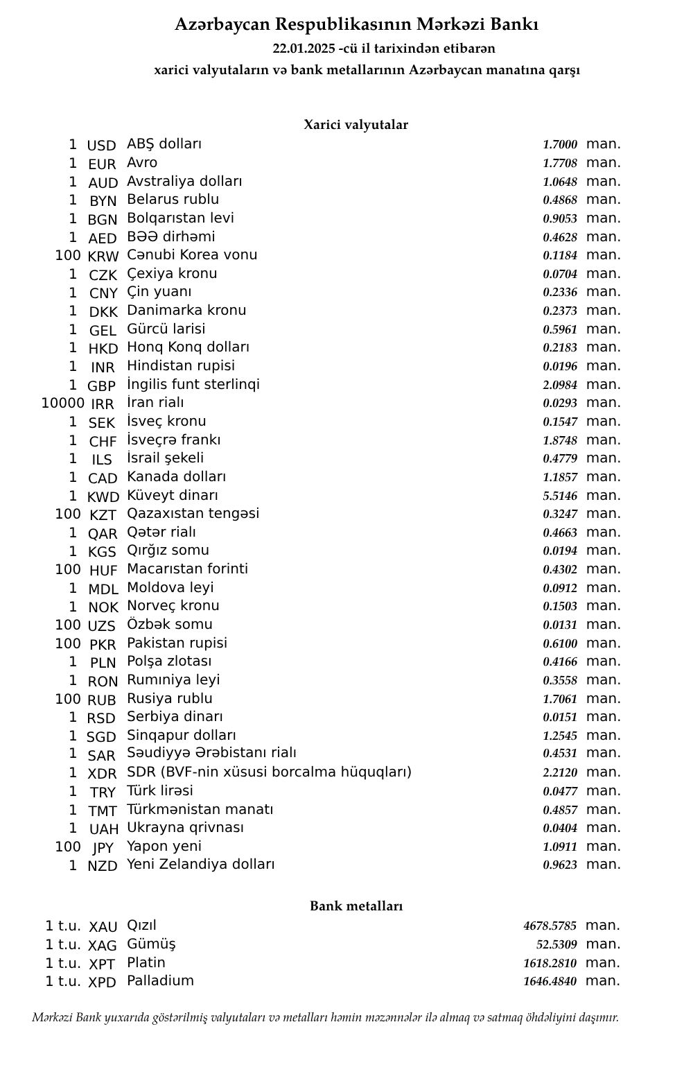 Rəsmi məzənnələr açıqlandı