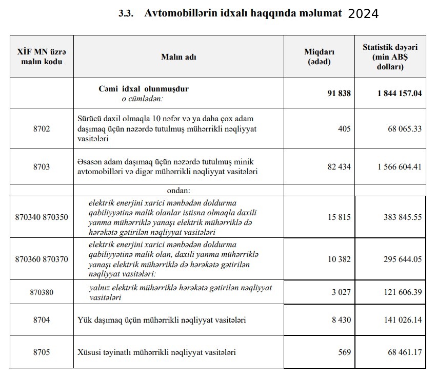 2023-cü ildə Azərbaycana 1 milyard 680 milyon 653 min dollar dəyərində 95 min 971 ədəd nəqliyyat vasitəsi idxal olunmuşdu.