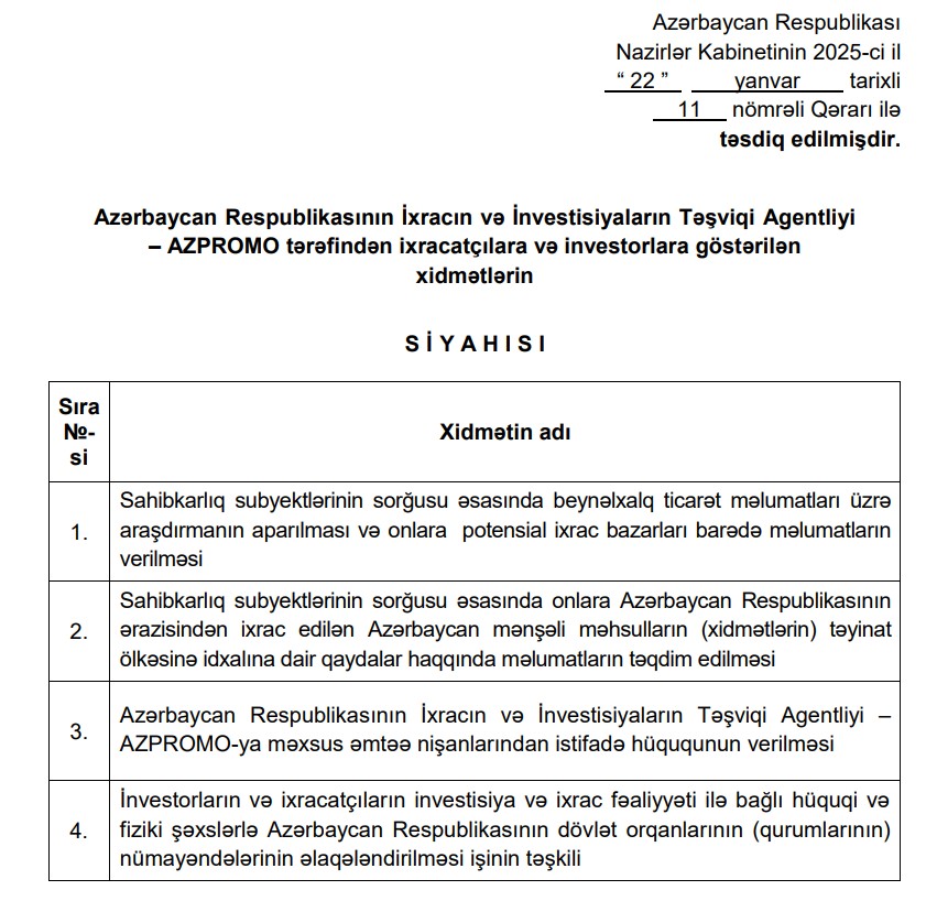 Marja.az xəbər verir ki, Qərar ilə,“Azərbaycan Respublikasının İxracın və İnvestisiyaların Təşviqi Agentliyi –AZPROMO tərəfindən ixracatçılara və investorlara göstərilən xidmətlərin siyahısı” təsdiq edilib.