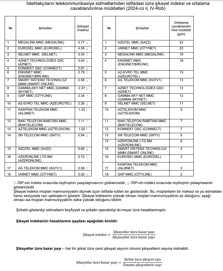 Şikayət indeksinin yüksək olması müştəri məmnuniyyətinin az olduğunu, aşağı olması isə müştəri məmnuniyyətinin daha yüksək olduğunu bildirir. MEGALİNK, EUROSEL və SELNET məmnuniyyətinin az olduğu şirkətlərdir.2024-cü ilin dekabrından etibarən telekommunikasiya sahəsində şəffaflığın təmin edilməsi və xidmət səviyyəsinin yüksəldilməsi məqsədilə İnformasiya Kommunikasiya Texnologiyaları Agentliyi (İKTA) tərəfindən yeni layihənin icrasına başlanıb.