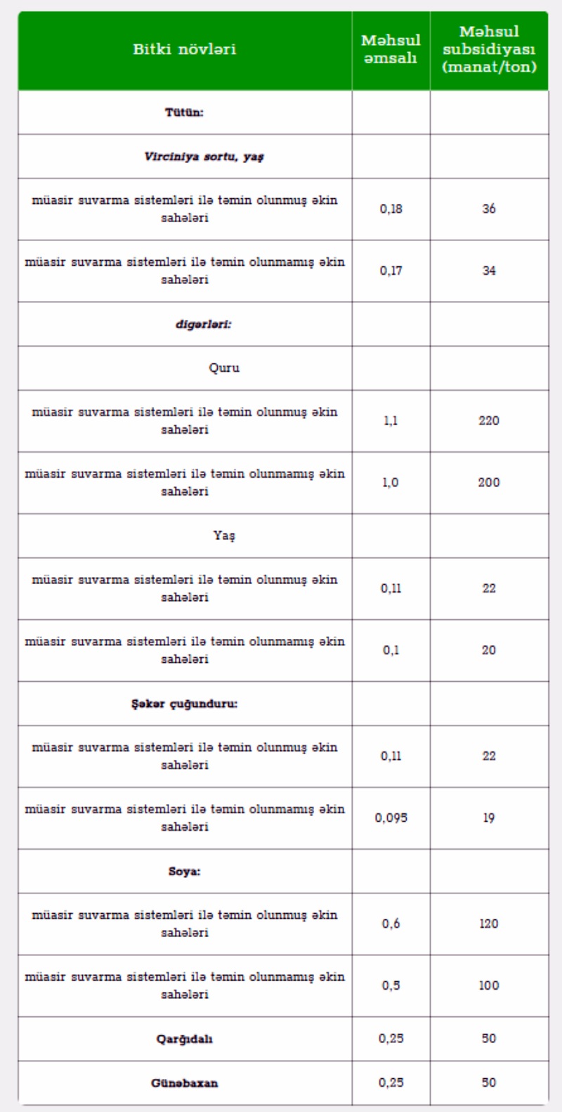 -2025-ci ildə məhsul subsidiyası 5 bitki (tütün, şəkər çuğunduru, soya, qarğıdalı və günəbaxan) üzrə aşağıdakı əmsallara uyğun olaraq veriləcəkdir: