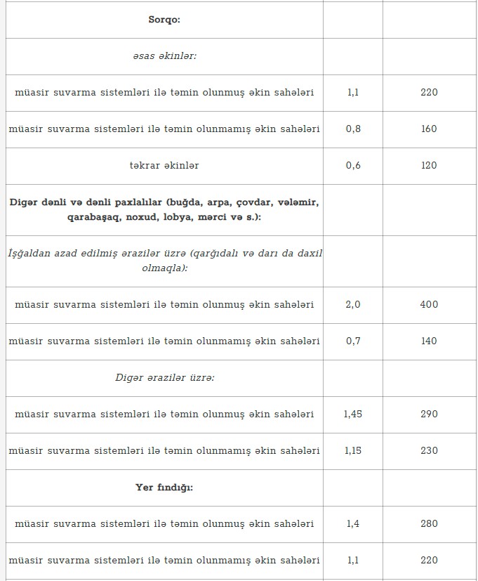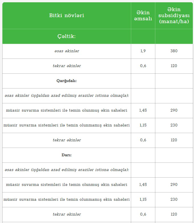 - Birillik bitkilər üzrə əsas əkin subsidiyası və təkrar əkin subsidiyalarının ödənilməsi üçün ayrı ayrılıqda cəmi əkin sahəsi 10 hektar və ya daha artıq olan arpa, buğda, çəltik və qarğıdalı əkinləri;