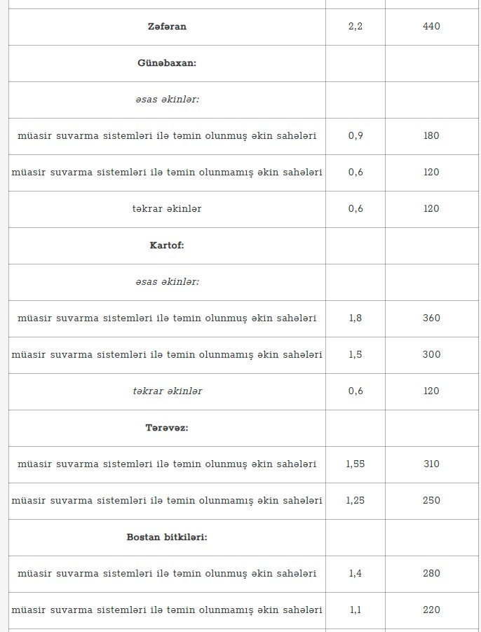 - -Şuranın 2025-cü il üzrə bitkilər və regionlara görə əkin, məhsul və toxum əmsallarının, toxum və ting kvotalarının və əkin ehtiyaclarının müəyyən edilməsinə dair 2024-cü il 29 avqust tarixli Qərarının 3-cü bəndi ilə müəyyən şəkər çuğunduru üçün məhsul əmsalı müasir suvarma sistemi ilə təmin olunmuş əkin sahələri üzrə 19 manatdan 22 manata, müasir suvarma sistemi ilə təmin olunmamış əkin sahələri üzrə 18 manatdan 19 manata qədər artırılmışdır.