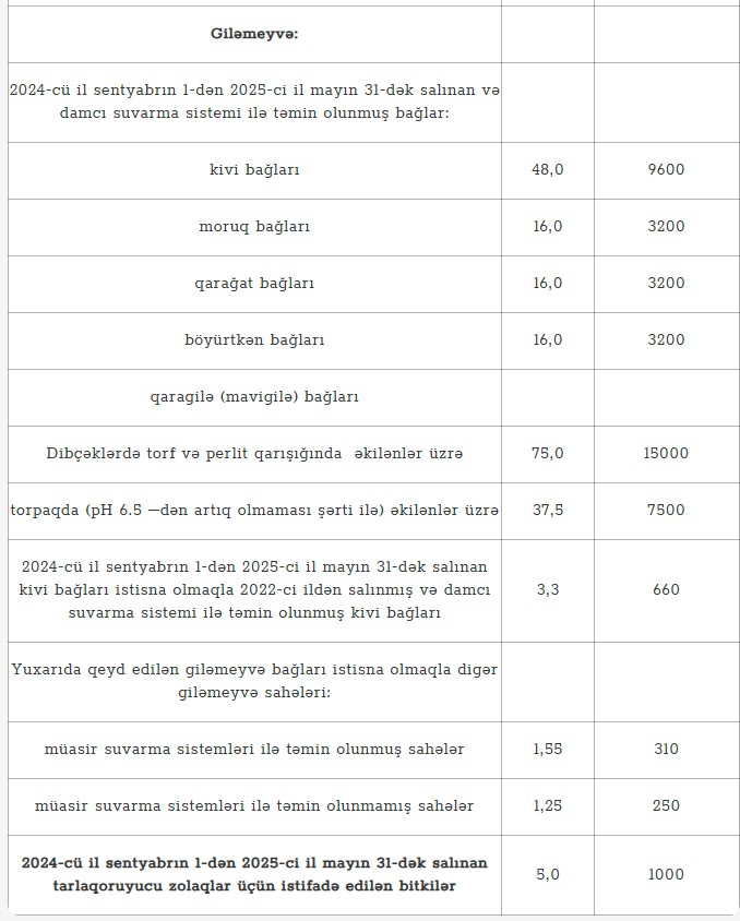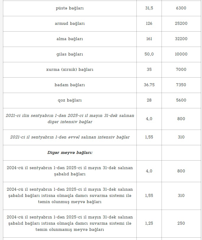 Aqrar Subsidiya Şurasının qərarına əsasən 2024-cü il sentyabrın 1-dən 2025-ci il mayın 31-dək: