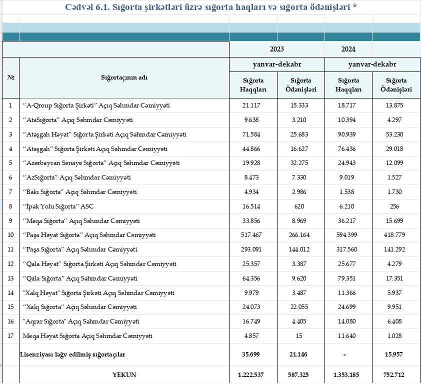 Müqayisə üçün qeyd edək ki, 2023-cü ildə "Meqa Sığorta" ASC 33 milyon 856 min manat sığorta haqları hesablamış, 8 milyon 969 min manat sığorta ödənişləri həyata keçirmişdi. Beləliklə, ötən il "Meqa Sığorta"nın hesabladığı sığorta haqları 2 milyon 361 min manat və ya 7%, sığorta ödənişləri isə 6 milyon 730 min manat və ya 75% artıb.