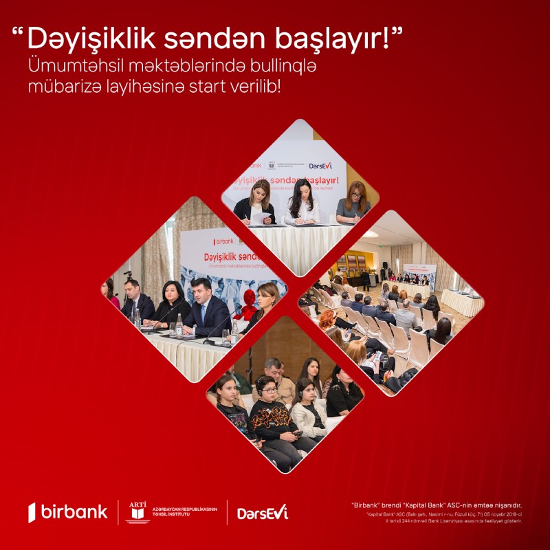 (®) Birbank-ın təşəbbüsü və sponsorluğu, “Dərs Evi” Tədris Mərkəzinin təşkilatçılığı və Azərbaycan Respublikasının Təhsil İnstitutunun dəstəyi ilə “Dəyişiklik səndən başlayır!” ümumtəhsil məktəblərində bullinqlə mübarizə layihəsinə start verilib.