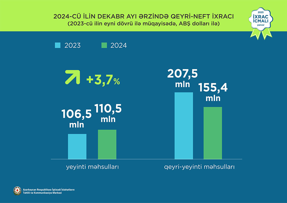İcmala əsasən, 2024-cü ilin yanvar-dekabr ayları ərzində Azərbaycanın qeyri-neft-qaz ixracı 2023-cü ilin müvafiq dövrü ilə müqayisədə 0,3% artaraq 3,4 milyard ABŞ dolları təşkil edib. 2024-cü ilin yanvar-dekabr ayları ərzində yeyinti məhsullarının ixracı 11,3% artaraq 1,03 milyard ABŞ dollarına bərabər olub.
